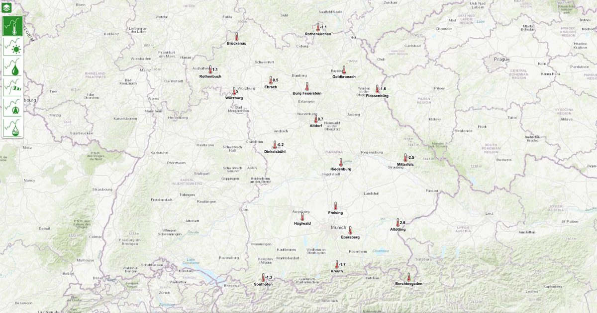 Wenn Sie aktuelle Daten der Höglwald-Station abrufen wollen, so finden Sie diese unter www.fovgis.bayern.de/wks. Je nachdem was Sie in der Karte auf der linken Seite auswählen, erhalten Sie Daten zu Niederschlag, Windstärke, … . Die Informationen werden von dem Betreiber der Waldklimastation, der Bayerischen Landesanstalt für Wald und Forstwirtschaft, zur Verfügung gestellt.